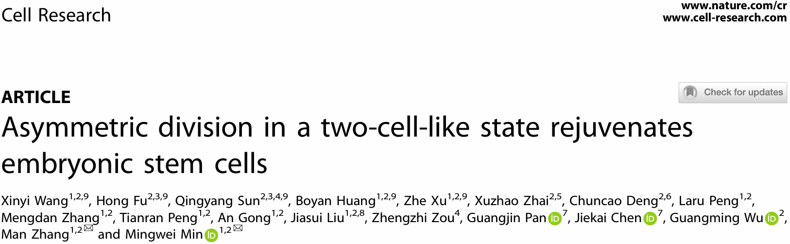 5. Wang, X. et al. Asymmetric division in a two-cell-like state rejuvenates embryonic stem cells. Cell Res 1–14 (2026) doi:10.1038/s41422-026-01221-z.