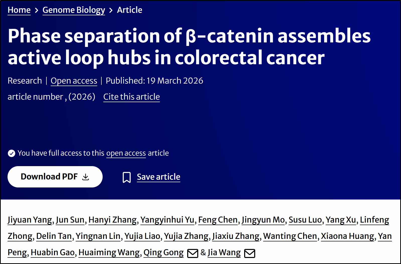 三维基因组结构异常是肿瘤的重要特征,但其调控机制仍不清晰,限制了对癌症发生发展的深入理解。2026年3月19日,广医-广州生物院联合生科院王佳教授、龚青教授团队联合多单位合作者在 Genome Biology 在线发表题为 “Phase separation of β-catenin assembles active loop hubs in colorectal cancer” 的研究论文。该研究利用HiChIP等多组学技术,在结直肠癌中鉴定出β-catenin相关的激活型loop hub结构,揭示β-catenin通过相分离组装多基因调控网络,从而驱动肿瘤进展。该工作明确了在肿瘤细胞中,相分离调控三维基因组结构这一机制。