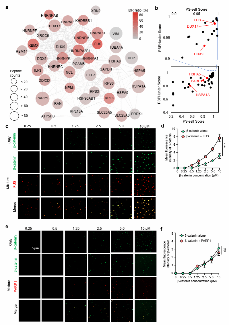 为解析凝聚体的组成及其功能,研究团队结合dCas9-APEX2邻近标记与质谱分析,系统鉴定了位于loop hub结构的β-catenin凝聚体的关键组分。结果显示,FUS作为“支架蛋白”促进凝聚体形成并增强β-catenin的相分离能力,而PARP1作为“顾客蛋白”被招募至凝聚体中,不参与相分离的维持(图3)。